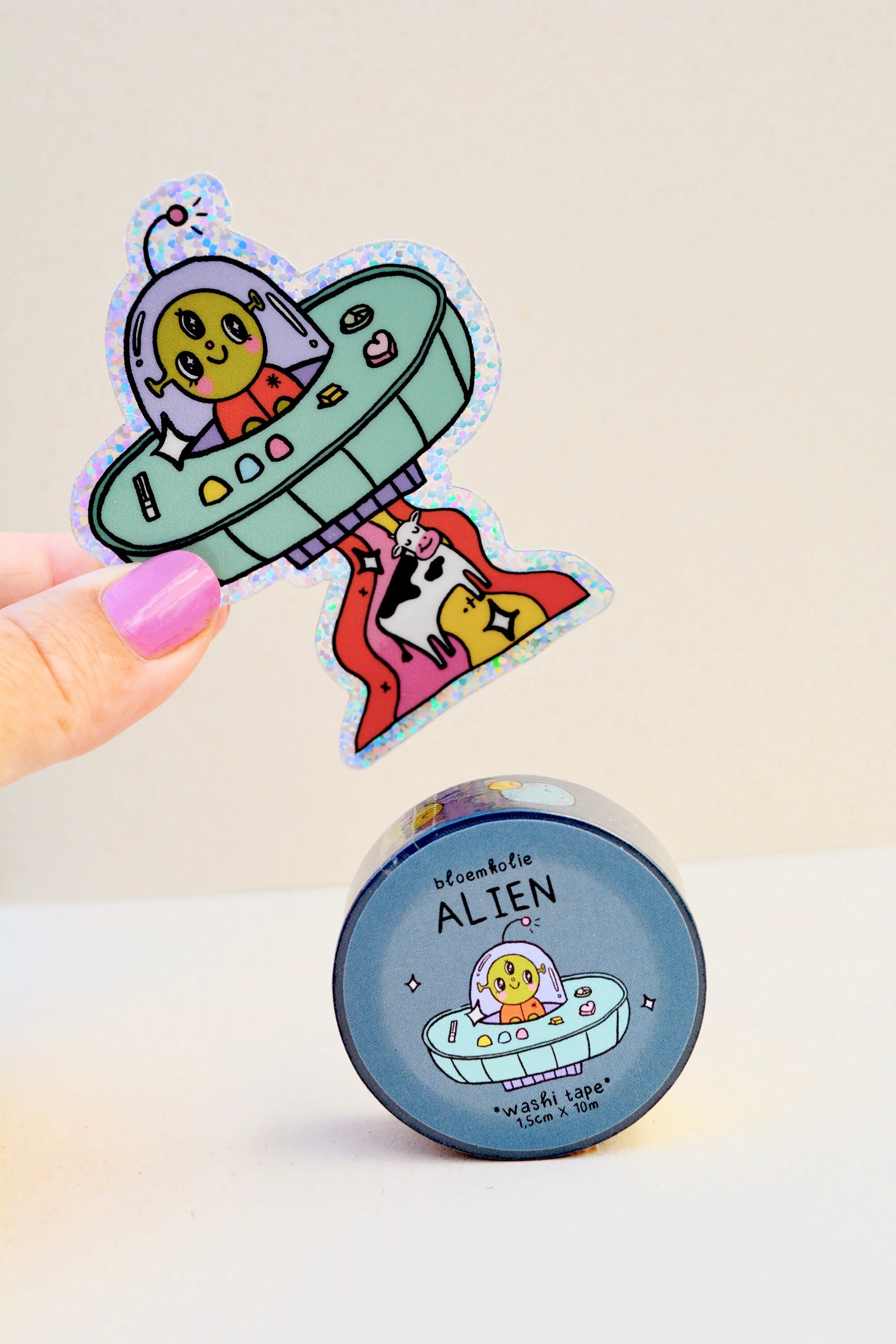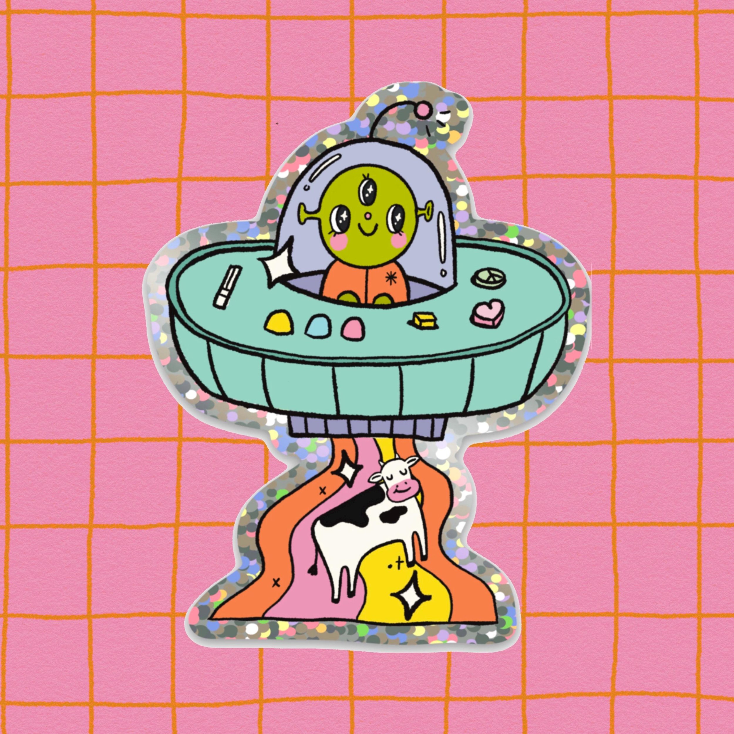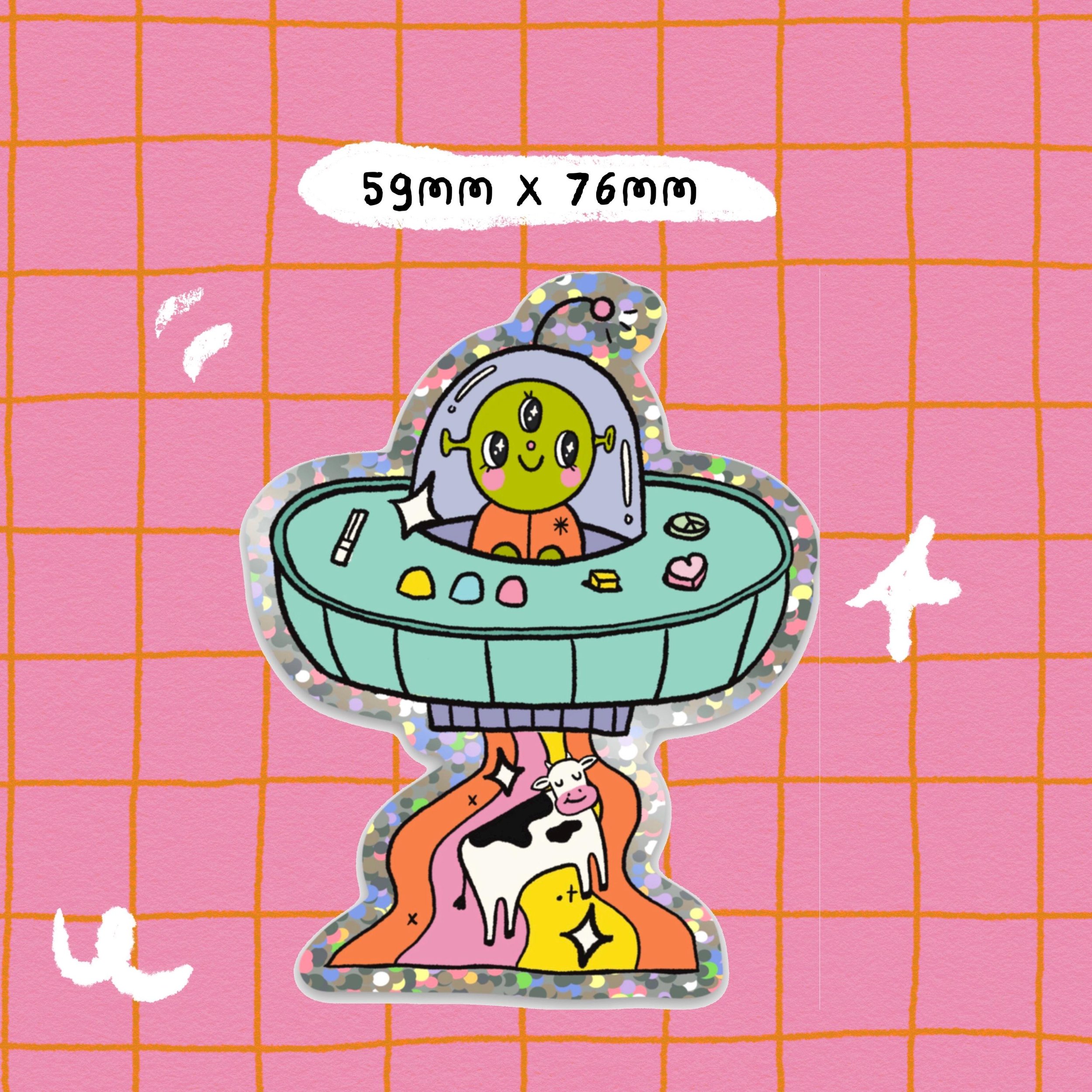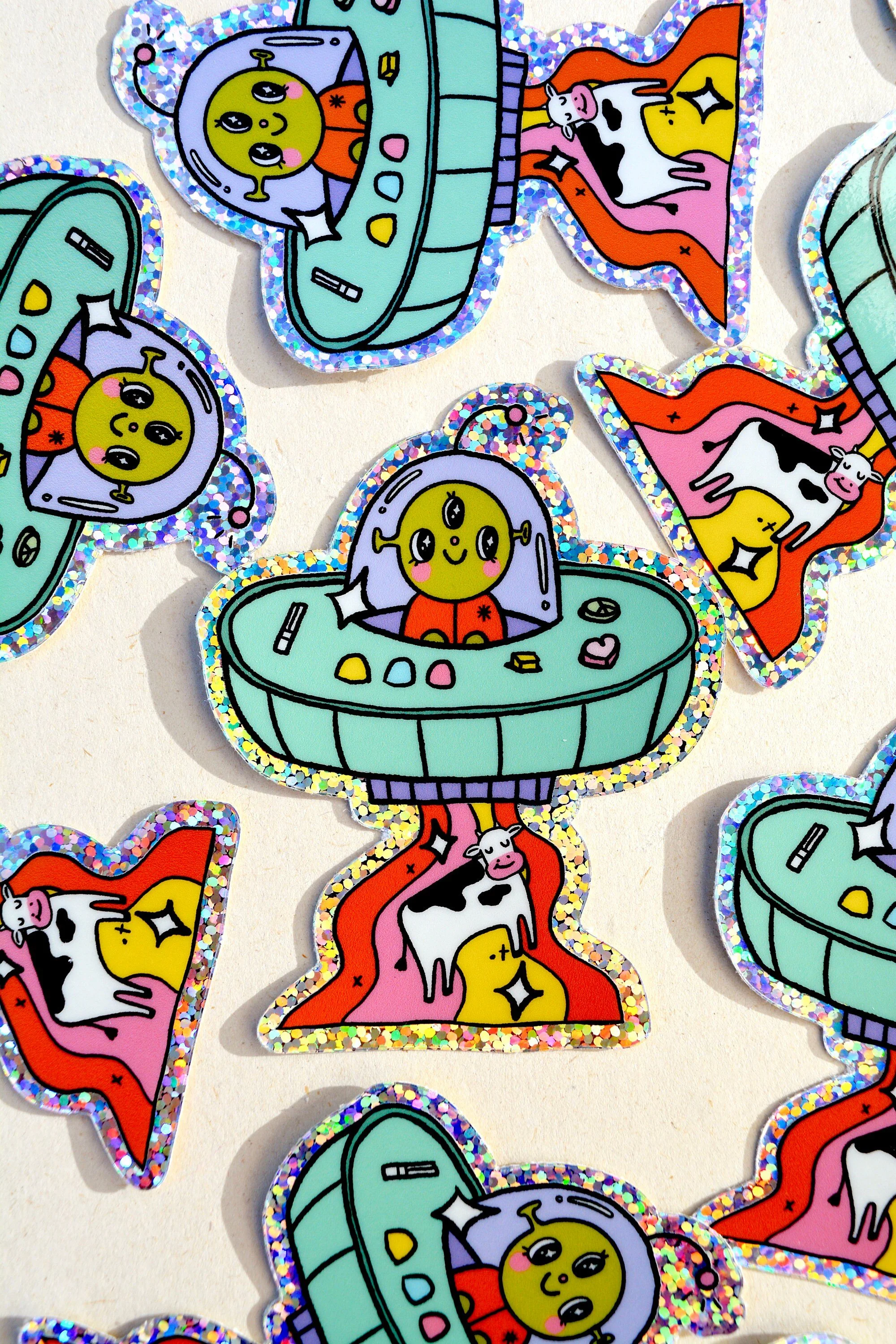 Add a dash of intergalactic charm to your belongings with our Glittery Alien Spaceship Sticker. This whimsical and dishwasher-safe sticker features an adorable alien in a spaceship on a mission to abduct a cow. It's the perfect blend of sparkle and sci-fi fun! 🐄✨