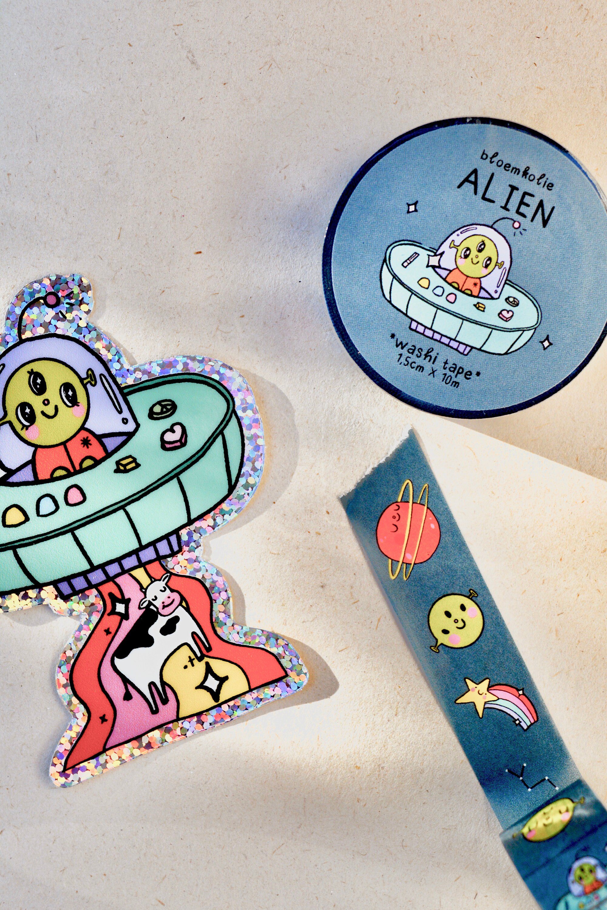 🛸 Cute Alien Illustration: Our sticker boasts a glittery illustration of an alien in a spaceship, ready to embark on an adorable adventure that's sure to bring smiles.